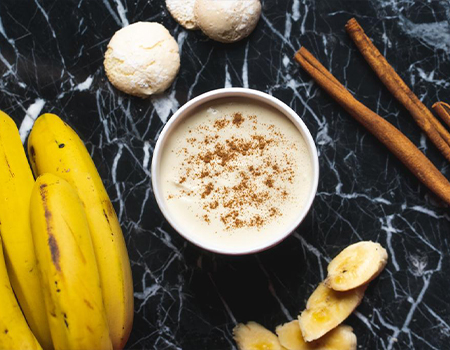 Massa leve, creme aveludado de banana, banana in natura e canela.