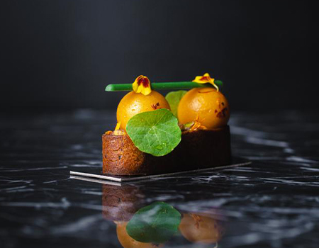 Massa de amêndoas com Tâmaras, creme de amêndoas, creme de pistache, esferas de Damasco com pimenta calabresa e açafrão iraniano.