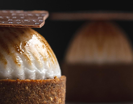 Tarte de biscoito tipo integral com mel e flor de sal, ganache de chocolate belga ao leite com amendoim, marshmallow artesanal de baunilha derretido no forno.