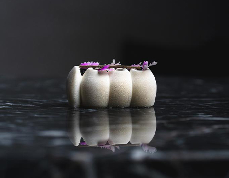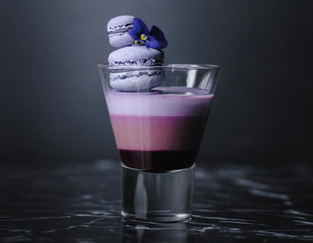 Panna cotta de lavanda, panna cotta de mirtilo, compota de mirtilo, macaron de lavanda e ganache de mirtilo.