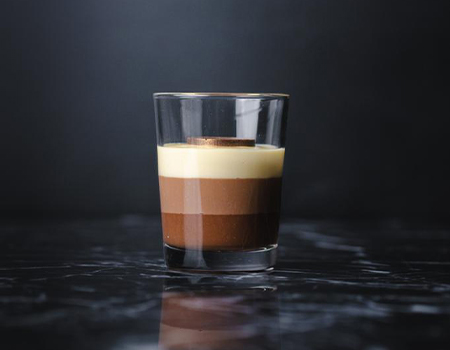 Massa leve, calda de amaretto, cremoso de chocolate meio amargo, cremoso de caramelo com chocolate ao leite, ganache de chocolate belga meio amargo, crips de chocolate belga.