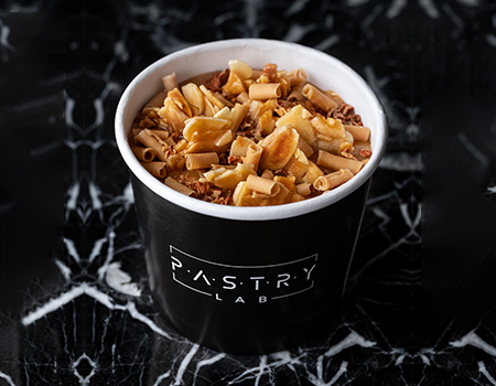 Massa leve, calda de amaretto, cremoso de pistache, cremoso de chocolate branco, gorgonzola, ganache de pistache.
